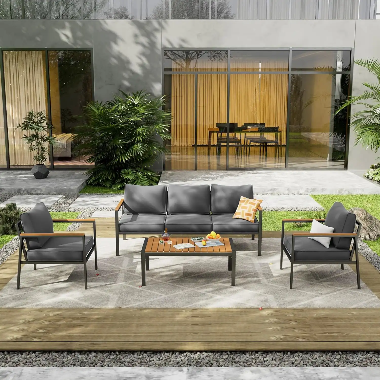 Metal Courtyard Furniture Set Plastic Wood Coffee Table Outdoor Balcony Furniture Sectional Sofa Garden Set